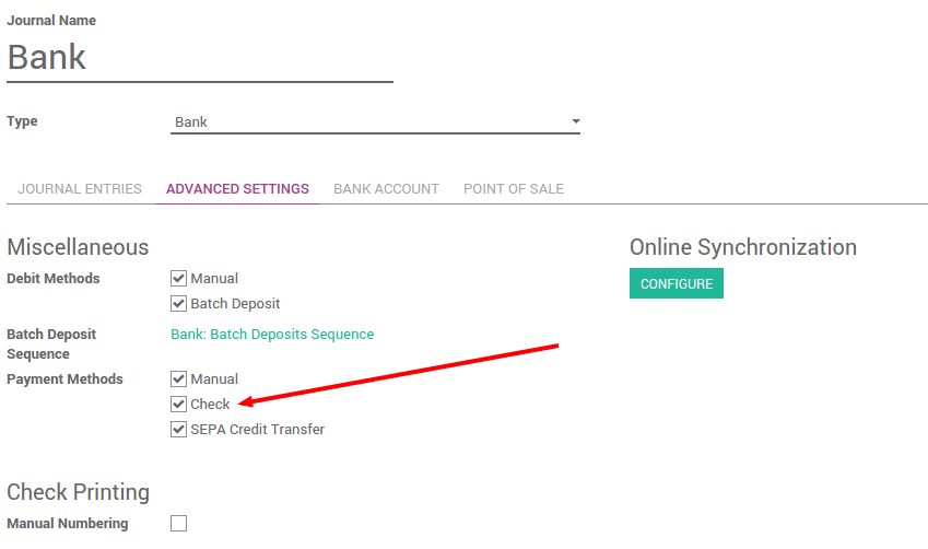 如需用支票支付,必须在银行账上激活付款方式。从会计仪表板(进入会计应用程序的界面),点击你的银行账户:选项. 在* 支付方式 字段,设置 检查 。