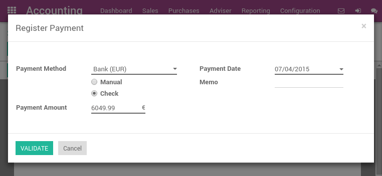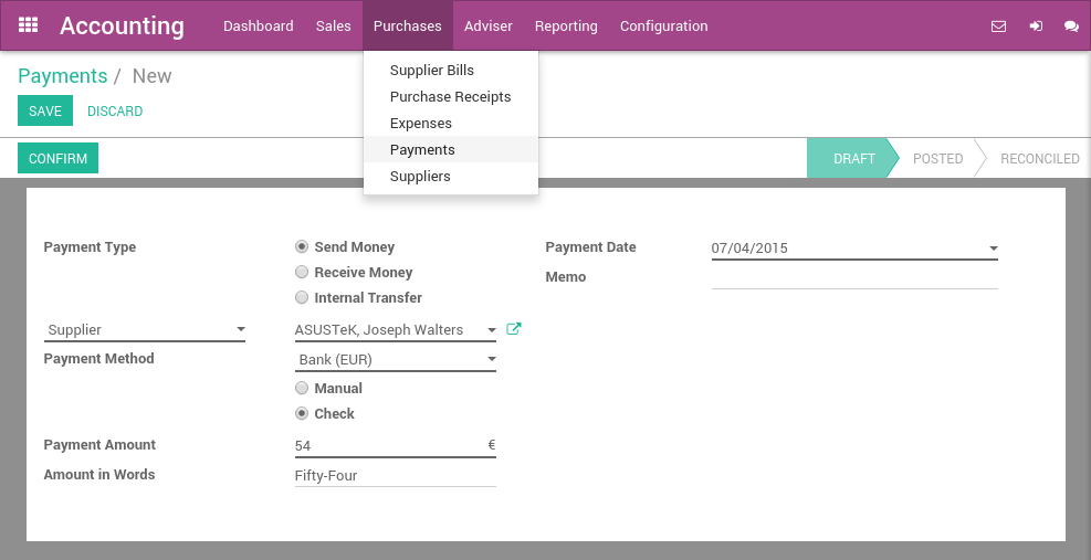 要在账单上登记付款,请从菜单中打开任何供应商账单 . 供应商账单验证通过后,您就可以登记付款。. 设置 支付方式 为 支票 并验证付款对话框.