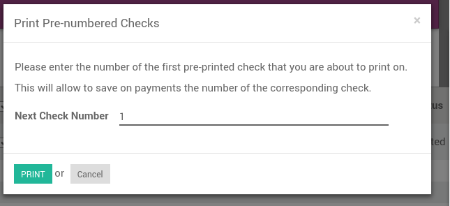 如果你想在打印前查看每笔付款,打开支付界面,点击* 打印支票 话框会问你检查的编号。它会自动提出你下一个编号,但是,如果编号不匹配, 可修改。