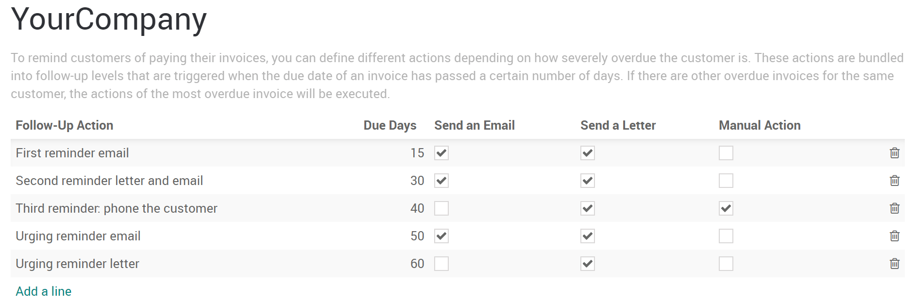 Odoo 默认提供包含多项操作的后续计划,但您可以根据需要进行自定义。根据具体的逾期天数,您可以计划发送电子邮件、信函或执行手动操作。您还可以根据流程的阶段编辑用于报表的模板。/p>