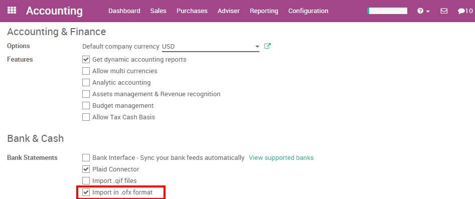 为了能导入OFX对账单, 您需要在Odoo激活特性。在会计应用程序中, 进入菜单 Configuration ‣ Settings . 从会计设置, 检查银行对账单选项 Import in .OFX Format 和应用。