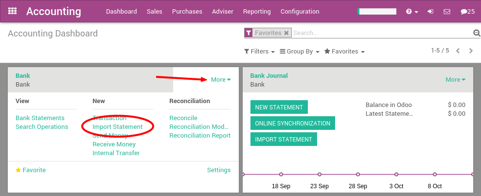 在导入你的第一个文件之后, Odoo会计仪表板将自动建议你导入更多文件。在接下来的文件导入, 你不需要去 More 菜单了, 您可以直接点击链接 Import Statement