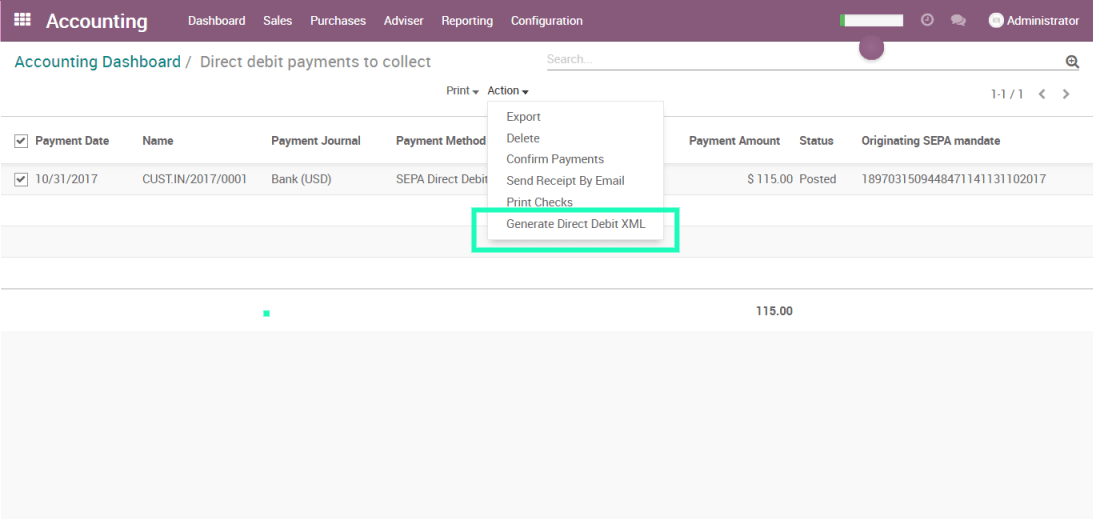 您在列表中选择要包含在 SDD 文件中的付款,点击“操作”,然后选择“生成直接借记 XML”。