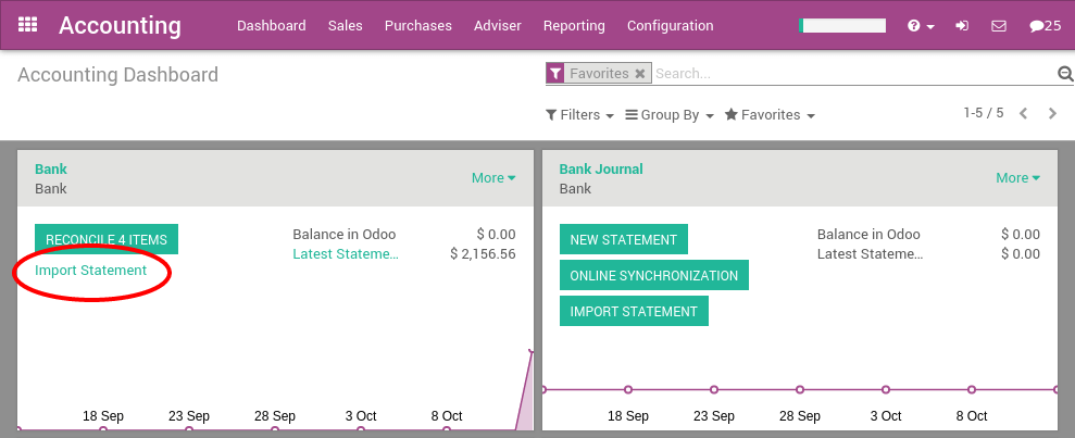 在导入你的第一个文件之后, Odoo会计仪表板将自动建议你导入更多文件。在接下来的文件导入, 你不需要去 更多 菜单了, 您可以直接点击链接 导入陈述 。