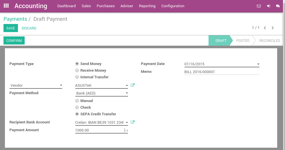 如果这是第一次支付这个供应商,需要填写收件人的银行账户信息,至少需要:银行的名字, IBAN 和 BIC(银行识别码)。Odoo会自动验证IBAN的格式。