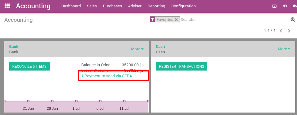 在会计仪表板,您可看到是否有银行账户生成的SEPA文件。