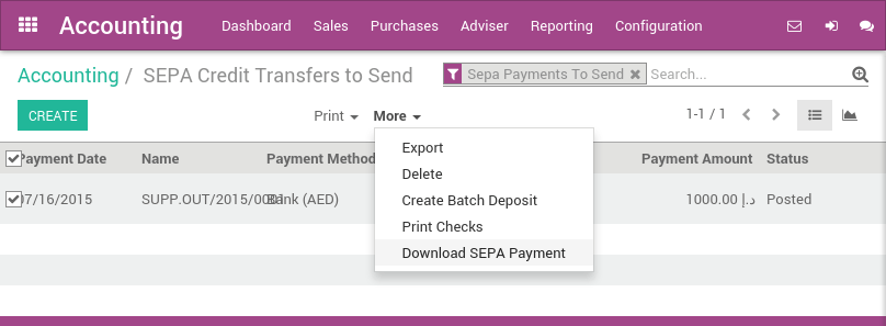 用SEPA支付,必须安装* SEPA信用转帐 [UNKNOWN NODE problematic]模块。这个模块将Odoo付款申请生成SEPA文件。