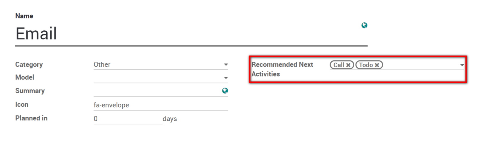 Odoo 默认提供多种通用活动类型(例如通话、电子邮件、会议等)。如果您想设置新的活动类型,请访问 .