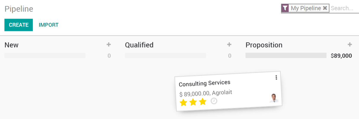 当您将一位潜在客户转化为商机后,您很可能需要他们发送报价单。您可以直接在 Odoo CRM 应用中执行此操作。 创建新报价通过点击任何机会或线索,您将看到一个“新报价”按钮,它将带您进入一个新菜单,您可以在其中管理您的报价。您将在该页面的“报价”菜单下找到针对该特定机会的所有报价。 标记为赢得或丢失现在您需要将您的机会标记为赢得或失去以推动该过程。 如果您将其标记为“赢单”,它们将移至看板视图中的“赢单”列。如果您将其标记为“输单”,它们将被存档。