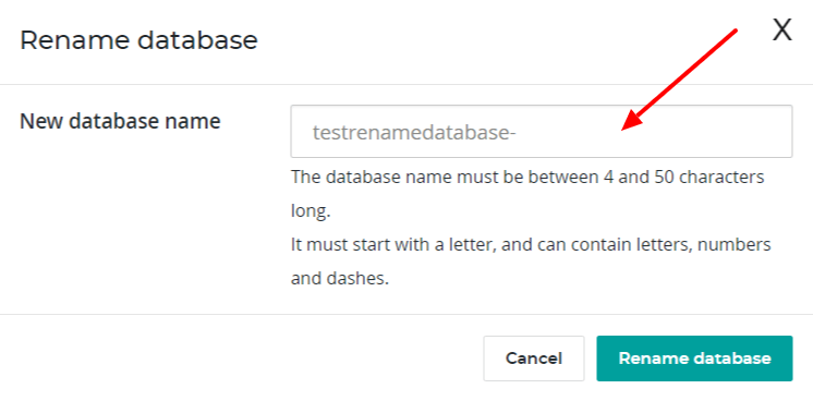 To rename your database, make sure you are connected to the database you want to rename, access the database management page and click Rename. You will have to give a new name to your database, then click Rename Database.