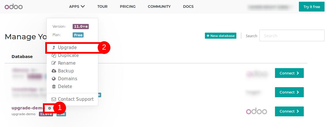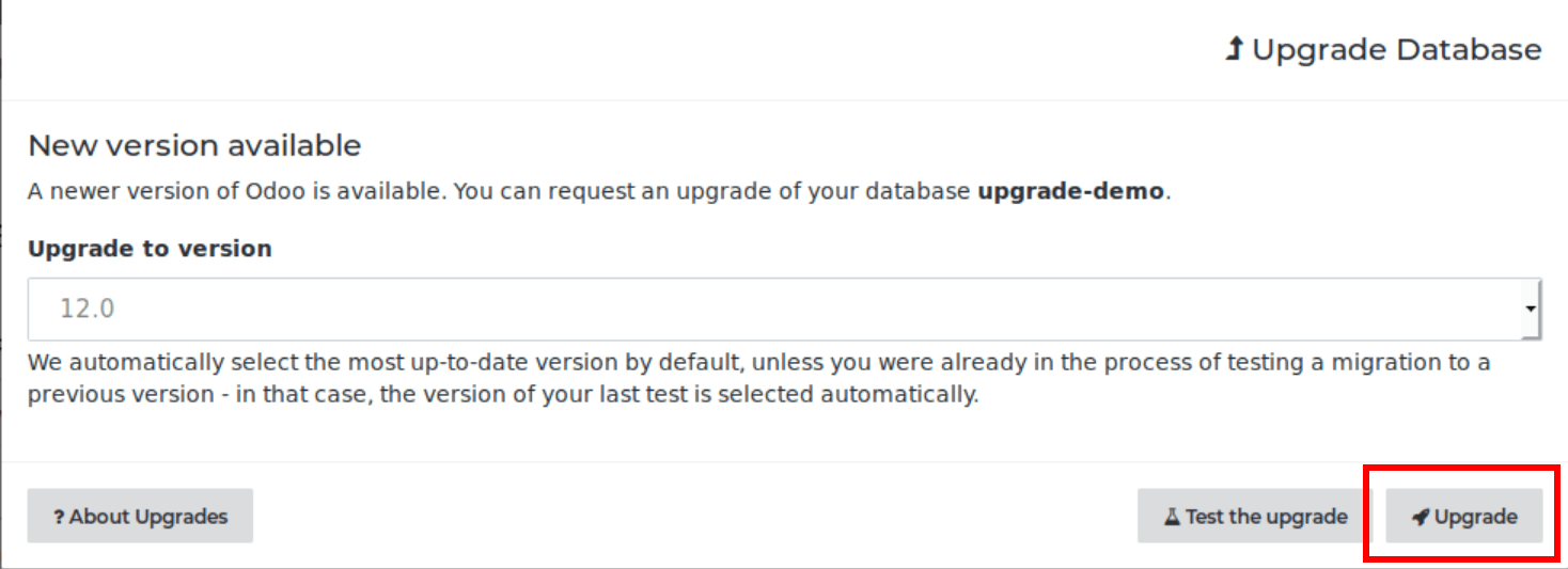 On the line of the database you want to upgrade, click on the “Cog” menu. If an newer version of Odoo is available, you will see an ‘Upgrade’ button.