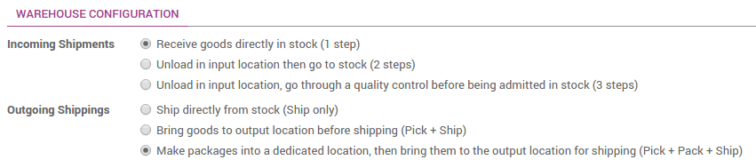 当一个订单进入到发货部门进入到最后的发货阶段, Odoo默认的设置是 一步 操作 :等所有货物都准备好, 就可以用一张发货单一次性的发货。然而, 该过程可能不能准确的反映公司的操作, 你的公司可能在发货之前需要更多的步骤。