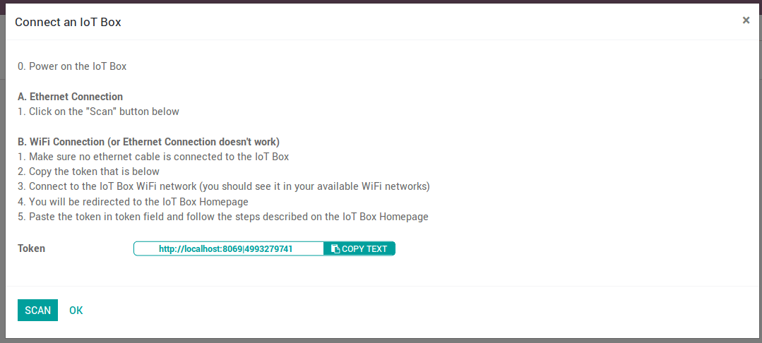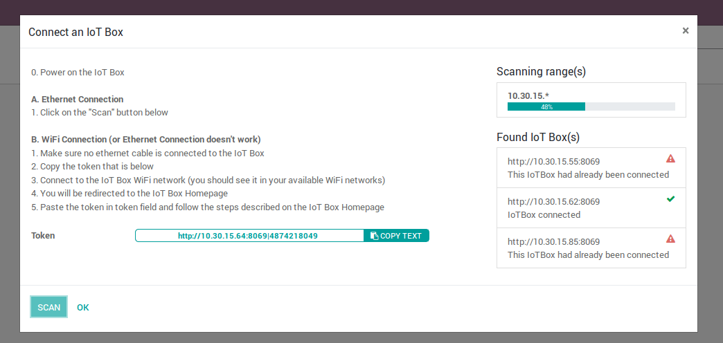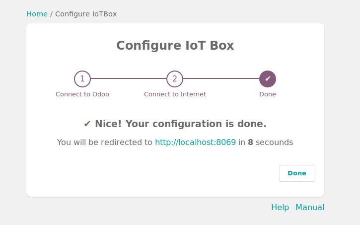 - You will be redirected to the IoT Box Homepage (if it doesn’t work, connect to the IP address of the box). Give a name to your IoT Box (not required) and paste the token, then click on next.