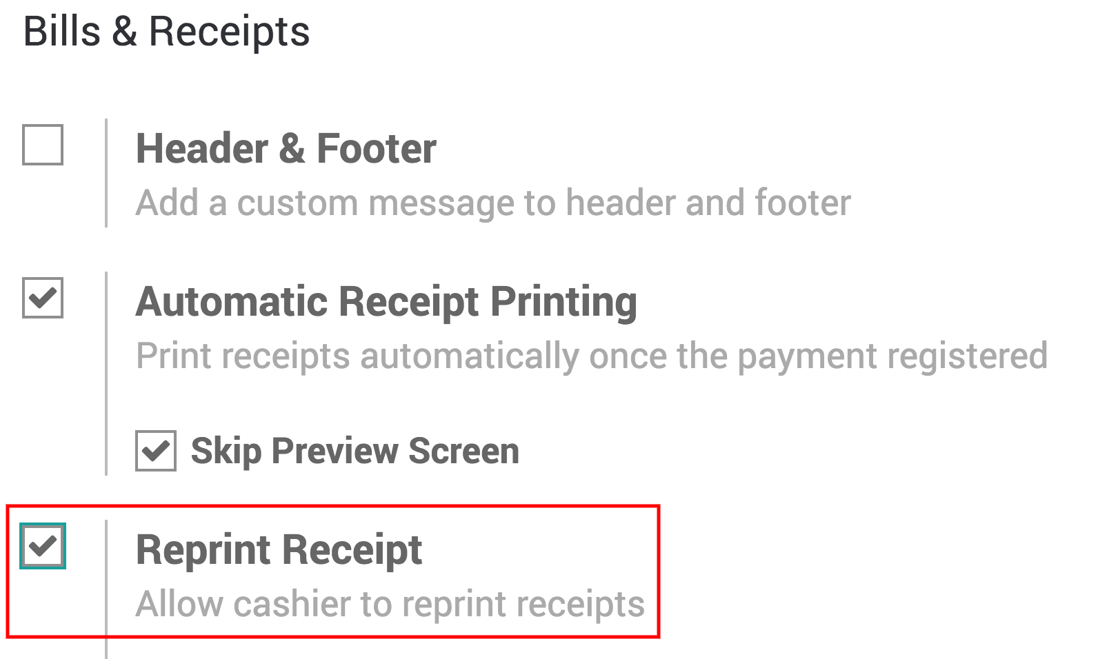 To activate Reprint Receipt, go to Point of Sale ‣ Configuration ‣ Point of sale. and select your PoS interface.