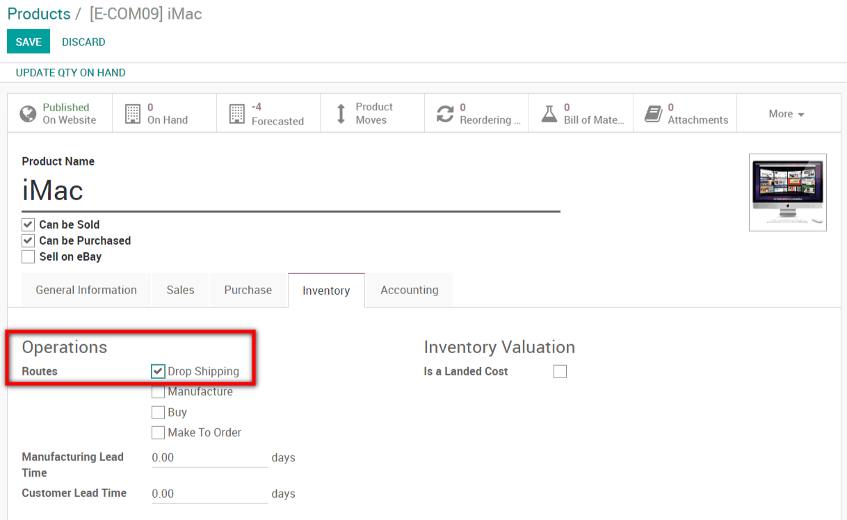 A new route Dropshipping has been created. You can go on a product and tick the dropshipping route. You also need to define to which vendor you will buy the product. Now, each time this product will be sold, it will be drop shipped.