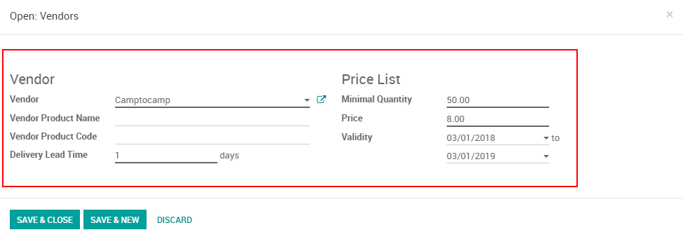 When you’re adding a vendor to a product, you’re able to add the vendor product name & code as well as set the minimal quantity, price and validity period.