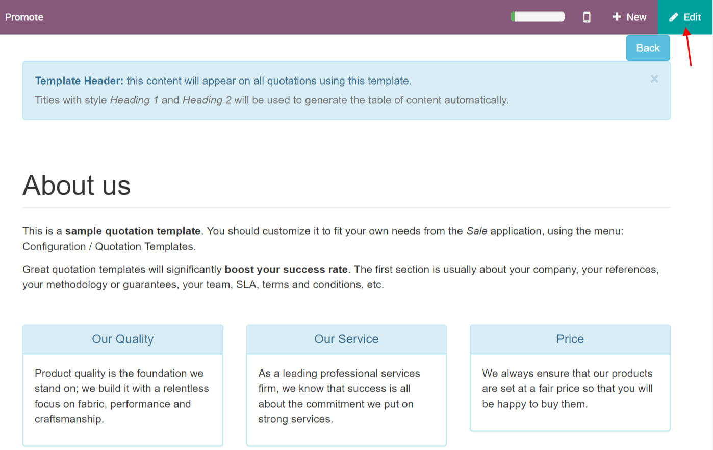 您可以编辑模板的客户界面,以便客户接受或支付报价。您可以在此处描述您的公司、服务和产品。点击编辑模板后,您将进入报价编辑器。