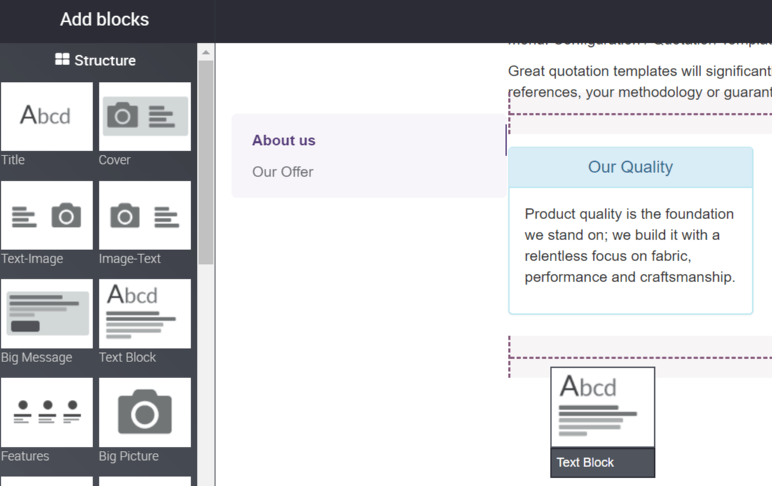 您可以通过拖放构建块来编辑产品描述内容。要描述您的产品,请在每个产品专用区域添加一个内容块。