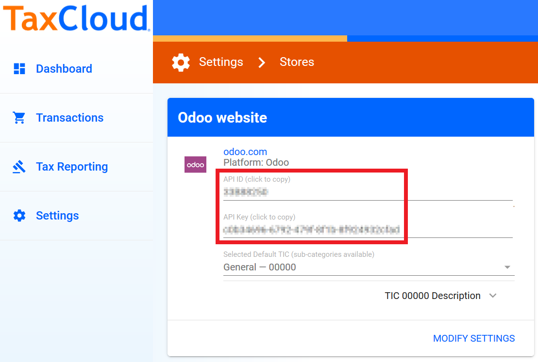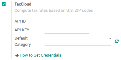 - 在 TaxCloud 上注册您的 Odoo 网站以获取 API ID and an API Key.