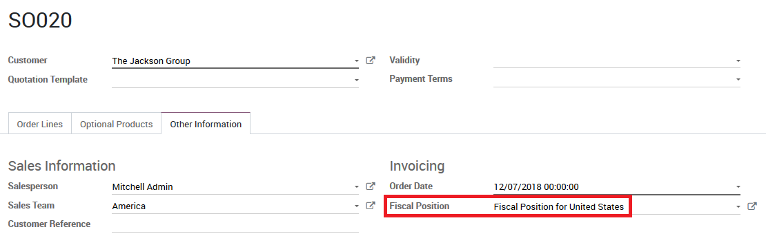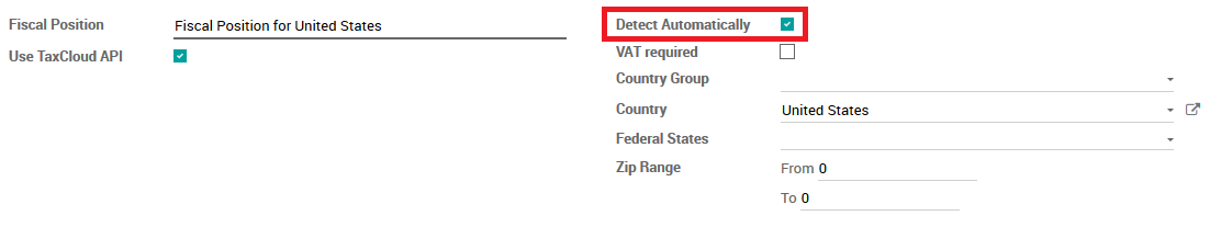 根据财务状况在 Odoo 中计算销售税 (see 如何适应税务对我的客户状态或定位). 在安装时创建美国的财政状况TaxCloud. 一切开箱即用