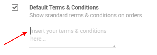 您可以在框中添加默认条款和条件。这些条款和条件将出现在每份报价单、采购订单和发票上。